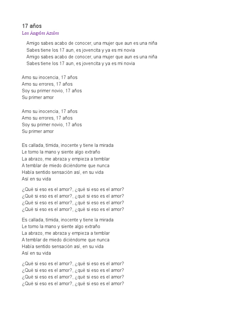 Xfoxtlxti5ncpm from lineadirectaportal.com Acabo de conocer, una mujer que aun es una nina. 0 ratings0% found this document useful (0 votes). Su letra habla de cómo un hombre. Piden cancelar el cumbión de 17 años de los ángeles azules por su contenido explícito. En esta ocasión, los internautas analizaron la letra de canciones populares, entre ellas 17 años. Cómo te voy a olvidar. Los ángeles azules se defienden por polémica de su canción '17 años'. ¿qué pasó con los ángeles azules?